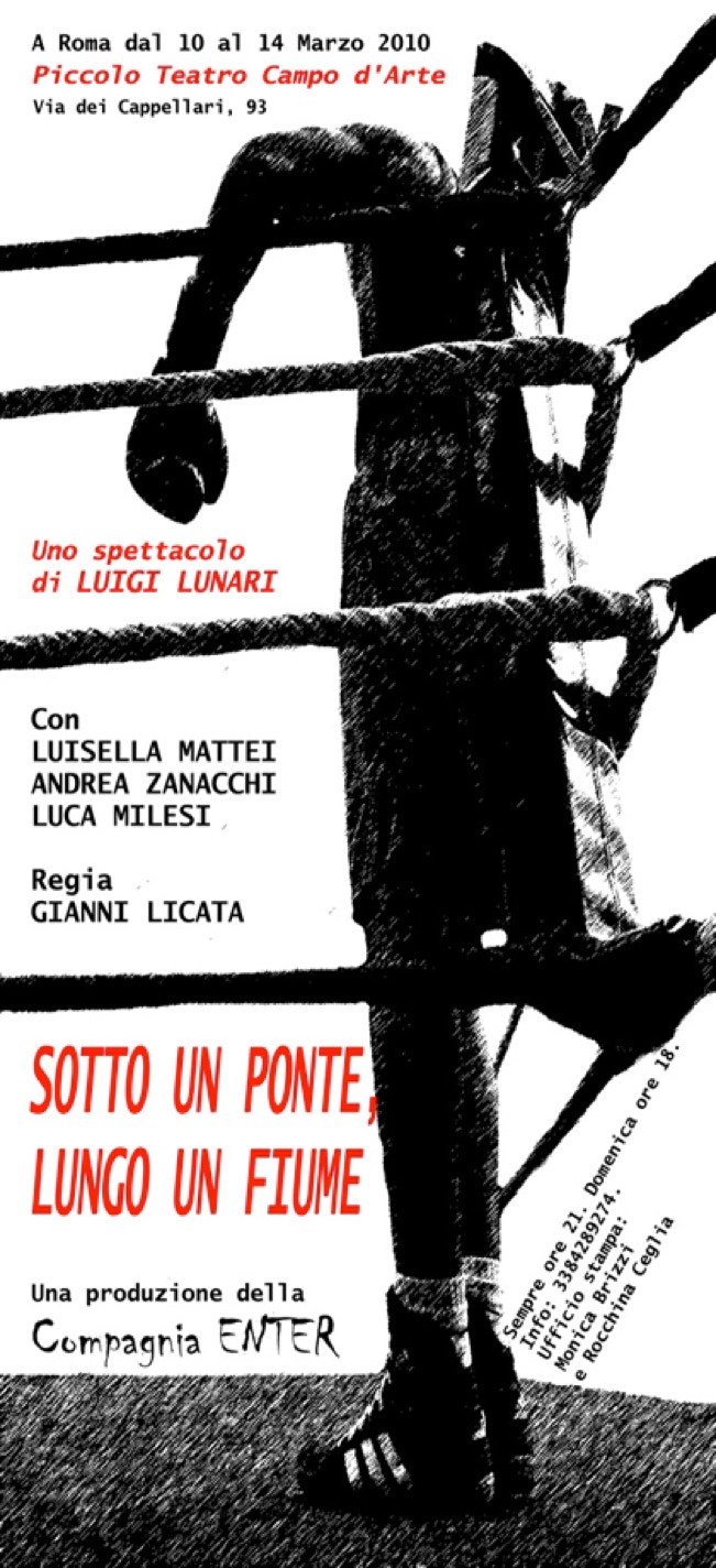 L’azione teatrale si svolge per l’appunto sotto un ponte lungo un fiume, all’estrema periferia di una città: “…un argine ripido, con radi ciuffi d’erba, solcato dalla traccia di un incerto sentiero che porta in alto, verso la strada. Ad un lato della scena, il cumulo di rifiuti di una discarica abusiva. All’altro lato, riparato dal ponte, un gabbiotto d’assi e di cartone, quasi uno scatolone, che serve evidentemente d’asilo a un qualche disperato…”.