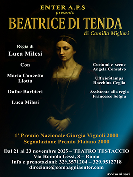 Lei, lui, l’Altra: il triangolo perfetto che tiene in equilibrio i rapporti “istituzionali” con quelli riservati al “dietro le quinte”. Ma c’è una “A” maiuscola che complica la situazione, perché nel nostro caso il terzo incomodo è un fantasma! Siamo nella Milano degli anni ’30 del 1800, una città in pieno fermento culturale e politico dove le accademie, i salotti ed i caffè ospitano conversazioni di altissimo profilo sull’arte, la letteratura e la politica: sullo sfondo l’utopia di un’unità di Italia ancora lunga da venire. E poi c’è una donna, non più in carne ed ossa da 400 anni, decisa ad uscire dall’oblio nel quale la precipitò la menzogna del secondo marito, il Duca di Milano Filippo Maria Visconti. Beatrice di Tenda, terza duchessa della città, fu condannata alla decapitazione nel 1418 con l’accusa – secondo la tradizione falsa – di aver tradito il marito per un musicista di corte. La scrittura agile, colta ed ironica di Camilla Migliori evoca sulla scena lo spirito di Beatrice, interpretata per noi da Maria Concetta Liotta. Colei che un tempo fu condottiera e donna di governo, appare una notte del 1833 alla giovane Emilia Branca (Dafne Barbieri), musicista e scultrice, promessa sposa di Felice Romani (Luca Milesi), autore di libretti d’opera: il suo intento è quello di ottenere la scrittura di un melodramma in suo onore. In un intreccio di confessioni reciproche, malintesi e piccoli peccati di gelosia assisteremo alla nascita fantasiosa di un melodramma che nella realtà vide le luci della ribalta per la prima volta proprio nel 1833, per mano del Bellini.